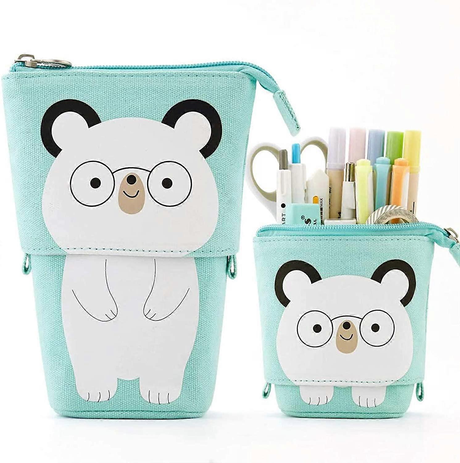 Telescopic Pencil Case Standing Canvas Pen Holder Cartoon Cute Cat Cosmetic Bags Office Supplies(Glasses Bear)