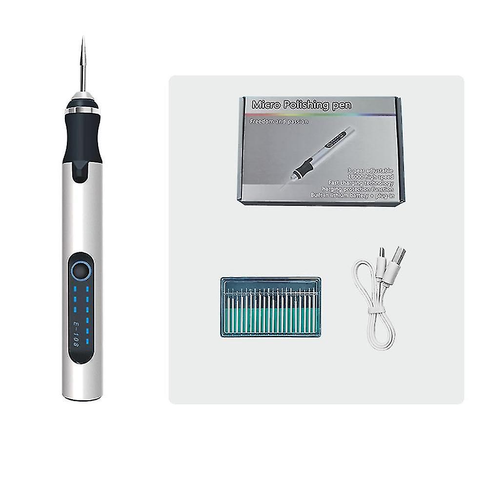 Product name: Electric sanding pen Product accessories: Grinding pen: 40g, 0.5m USB cable: 10g, 20 grinding heads: 60g. Instructions for use: press 1 block once in 2 seconds, press 2 blocks 2 times, press 3 blocks 3 times More than 2 seconds after starting, then press to turn off 3rd gear speed regulation: 1st speed 5000rpm, 2nd speed 10000rpm, 3rd speed 18000rpm Built-in lithium battery: 1300MAH charge cycle 800 times Shipping quantity: 1pcs Color: silver [USB wireless engraver] This engraving tool is equipped with a lithium battery and rechargeable by USB interface. Cordless use will last up to 30 minutes of inactivity after fully charged. Easy to help you complete a better engraved craft. [Multifunctional Wood Engraving Kit] This hand engraving kit can be used as an electric engraving machine or a small rotary tool, allowing you to carve, customize or decorate almost any surface in seconds, such as metal , plastic, glass, ceramic, wood, leather, diamond, stone and many more. It is perfect for small light jobs like DIY creation, crafts, light projects. [Safe and Comfortable Design] The lightweight and compact design of the engraving pen provides comfortable use for precision engraving performance from fine lines to deep grooves. The ergonomic handle adds extra comfort and stable control.