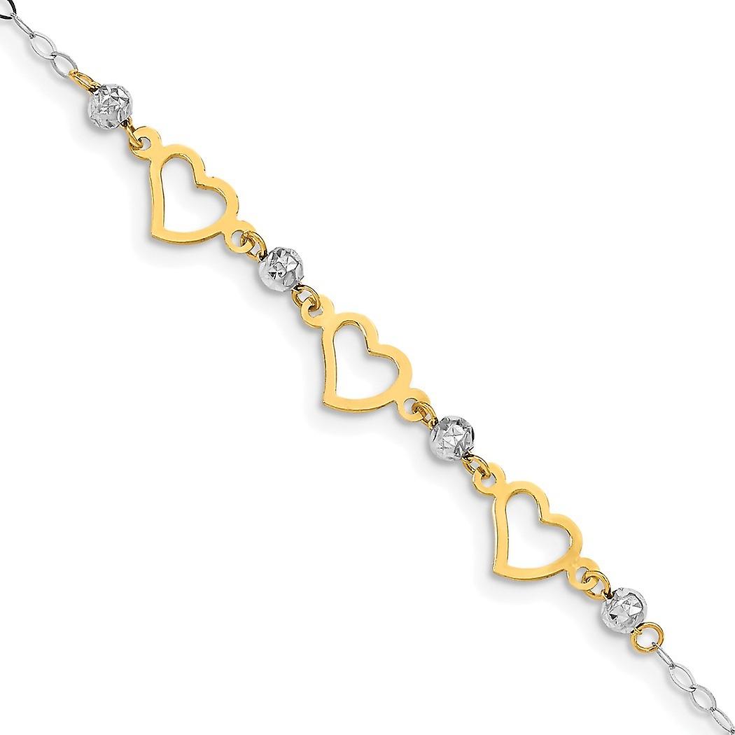 14k Two-Tone Polished Spring-Ring Gold Oval Link Sparkle-Cut Beads and Love Heart Bracelet 6mm Wide Link Bracelet for Wo