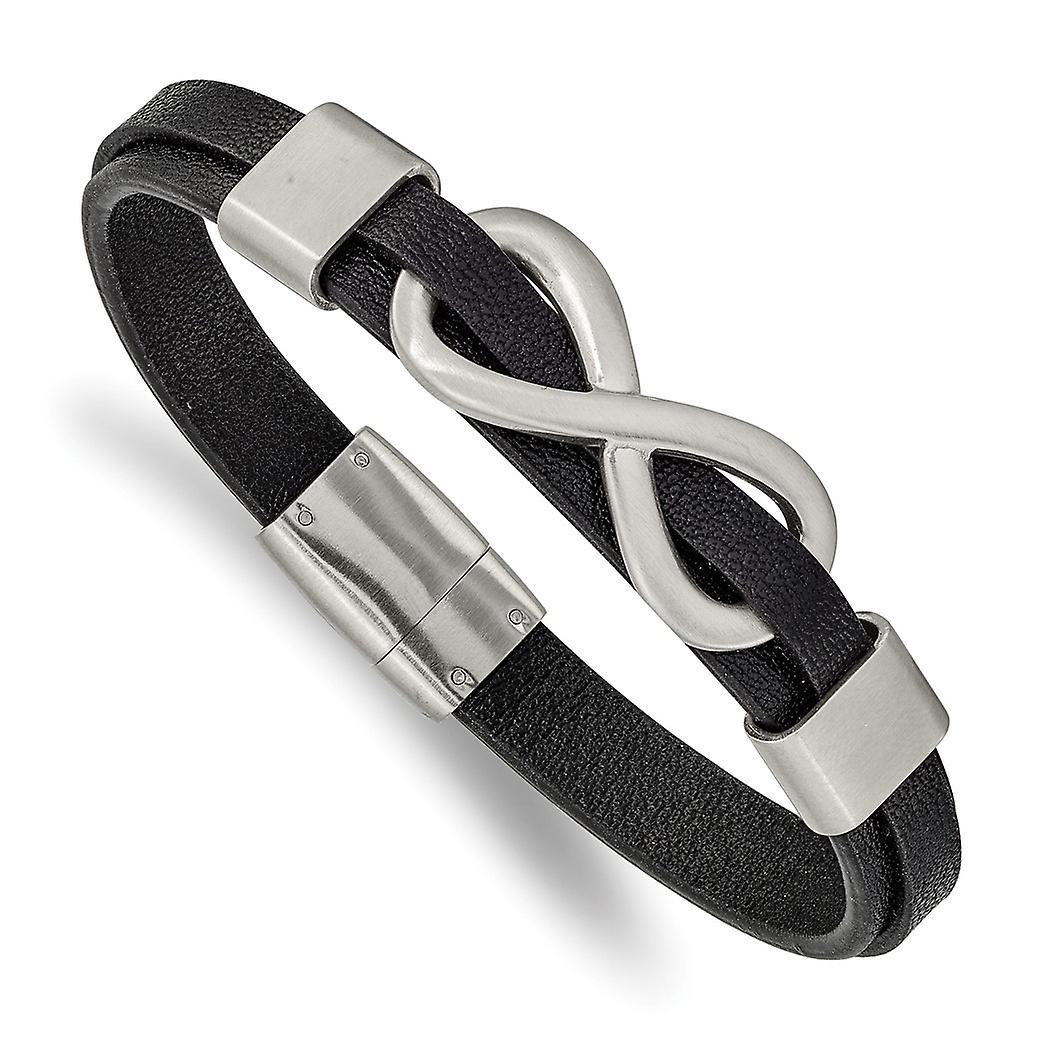 9.2mm Stainless Steel Brushed and Polished Infinity Symbol Black Leather Bracelet 8 Inch Link Bracelet for Women