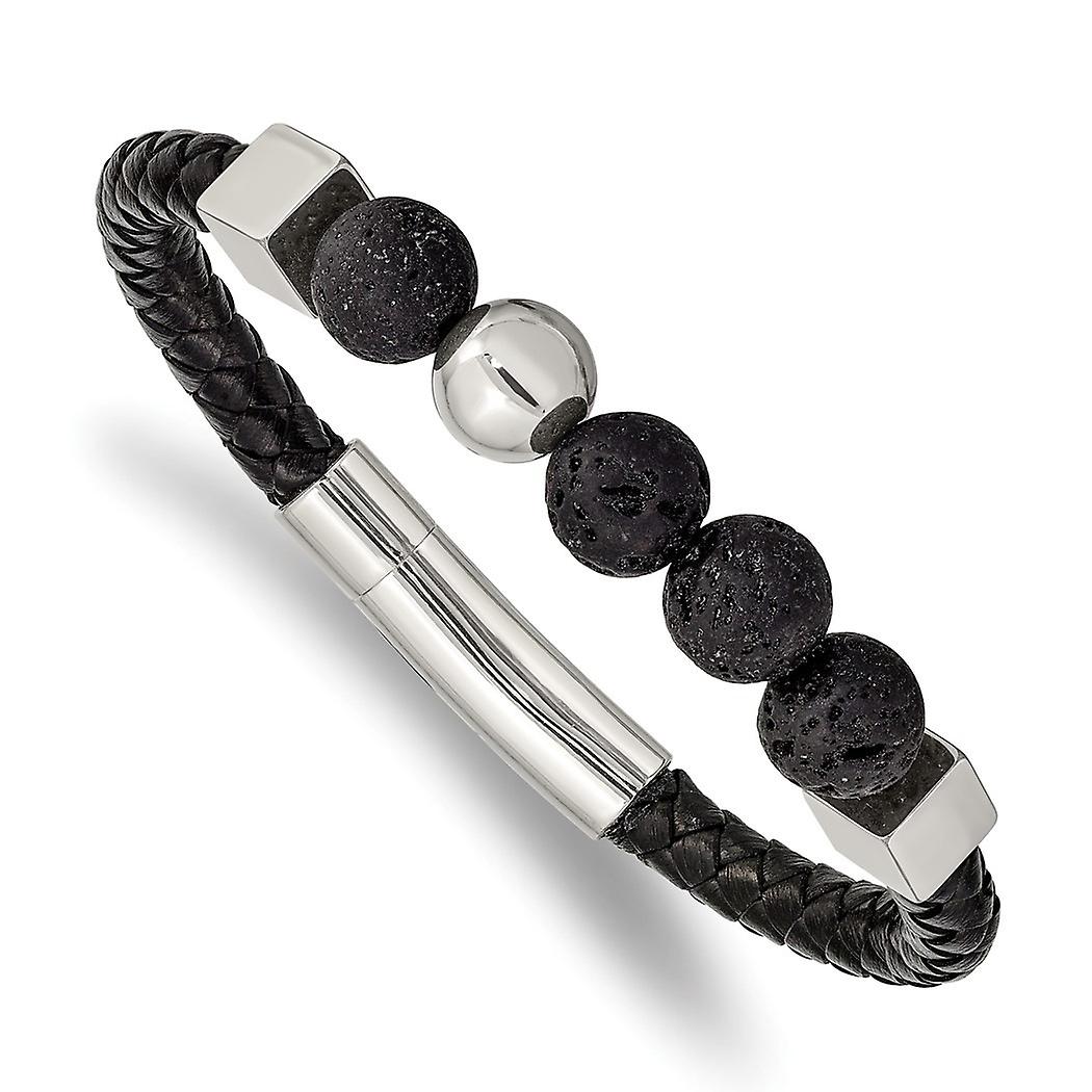 5.9mm Stainless Steel Polished With Lava Stone Beads Black Leather Bracelet - 8 Inch - 24.5 Grams In Solid Stainless Steel - - Width of Item: 5.9 mm - Length of Item: 8 in - Chain Length: 8 in - Clasp /Connector: Barrel - Finish: Polished - Chain Type: Leather -