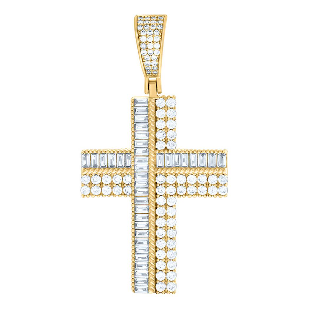 925 Sterling Silver Yellow-tone Mens Baguette Round Cubic Zirconia Cross Religious Charm Pendant 29.5x56mm Wide Necklace