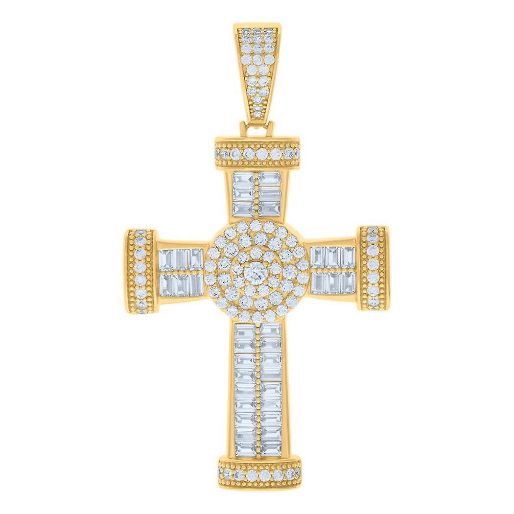 925 Sterling Silver Yellow-tone Mens Baguette Round Cubic Zirconia Cross Religious Charm Pendant 66x37.3mm Wide Necklace