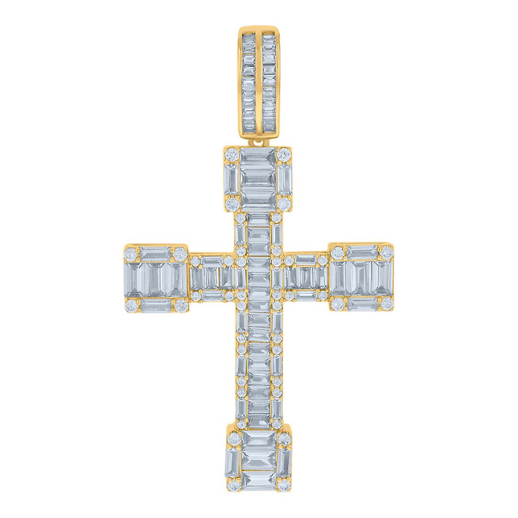 925 Sterling Silver Yellow-tone Mens Baguette Round Cubic Zirconia Cross Religious Charm Pendant 68.5x38.9mm Wide Neckla