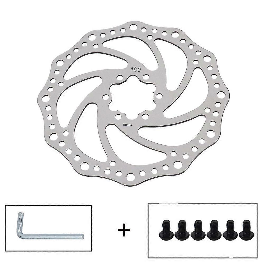 VERY GOOD BRAKING PERFORMANCE - The balanced number of openings on the brake ring ensures good braking performance in different weather conditions. Due to the shape and the number of openings, this brake disc is compatible with all types of disc brake pads (organic, semi-metallic, sintered). LONG DURABILITY - The balanced number of openings on the brake ring and their round shape make the brake disc extremely durable and reduce disc brake pad wear. Product specifications: outer diameter bicycle brake disc: 160mm; Center to center distance: 44mm; Thickness: 1.8mm; Number of holes: 6; Screw size: M5*12mm. Usage: This bicycle brake disc has good braking performance and is suitable for most bicycles, such as racing bike, mountain bike, cycling, etc. HIGH-QUALITY STAINLESS STEEL ALLOY - Due to the balanced ratio of steel and nickel additives, the brake disc is protected from rust and is characterized by high stability.