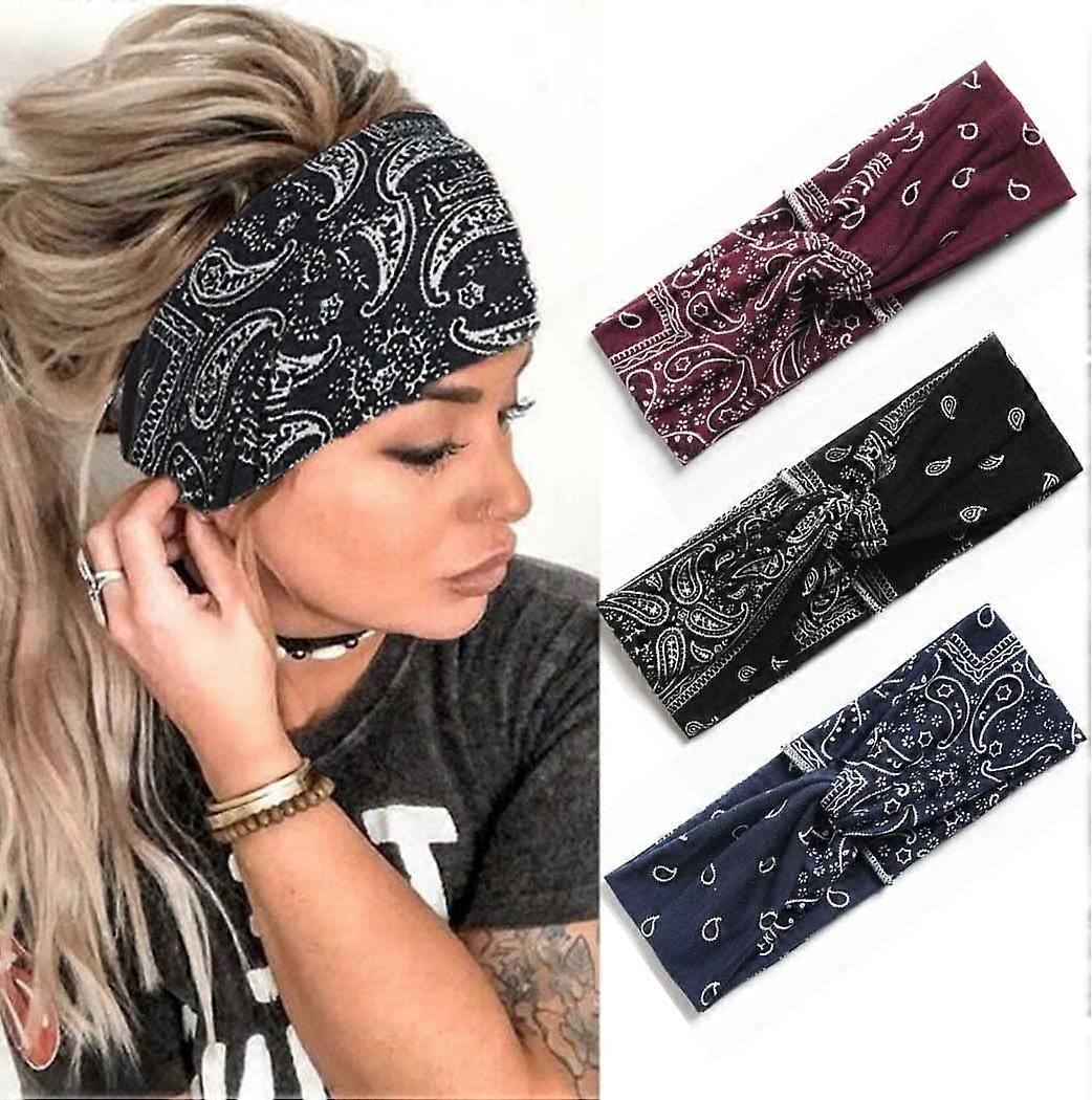 3 Piece Headband Black Print Elegant Hair Scarf Women Elastic Headband (A)