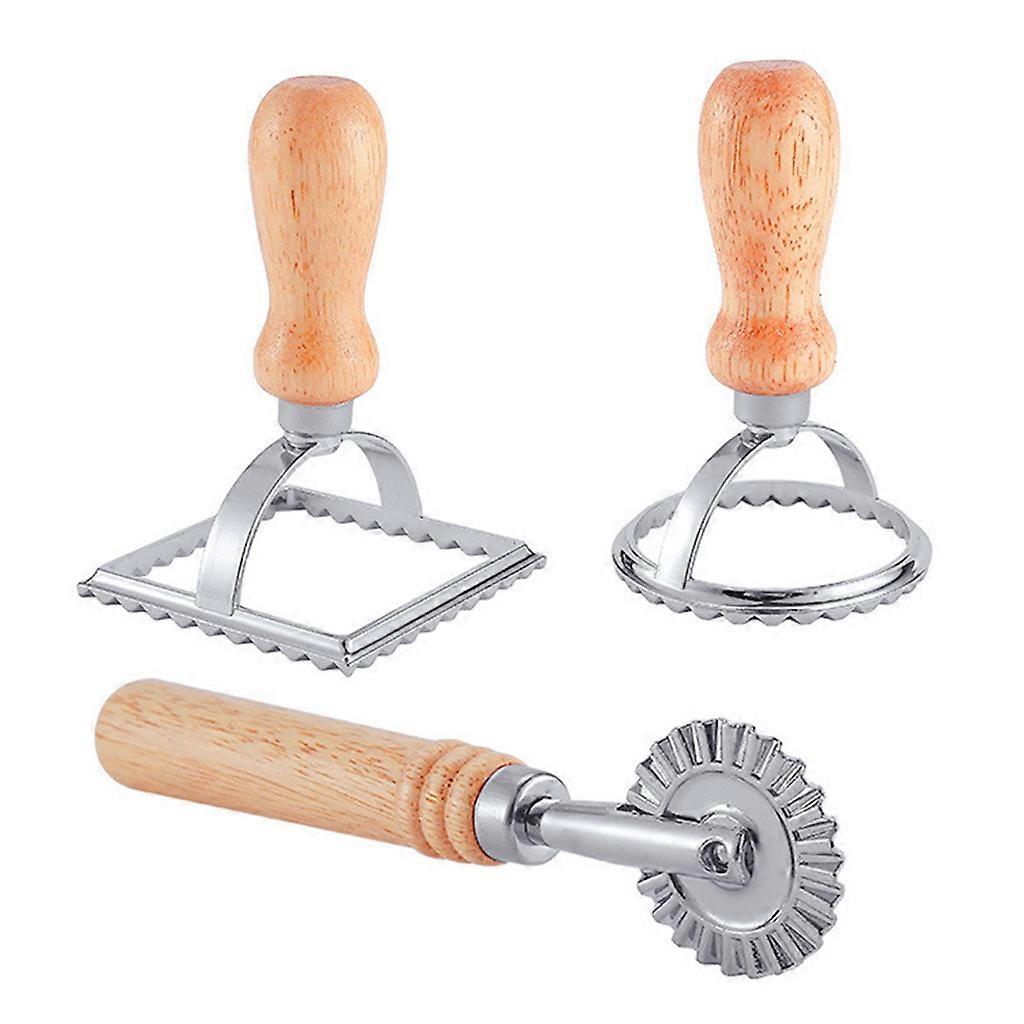 3 Pcs Ravioli Cutter with Roller Wheel Set Cookies Stamp Cutter Dough Pasta Maker Mold with Wooden Handle