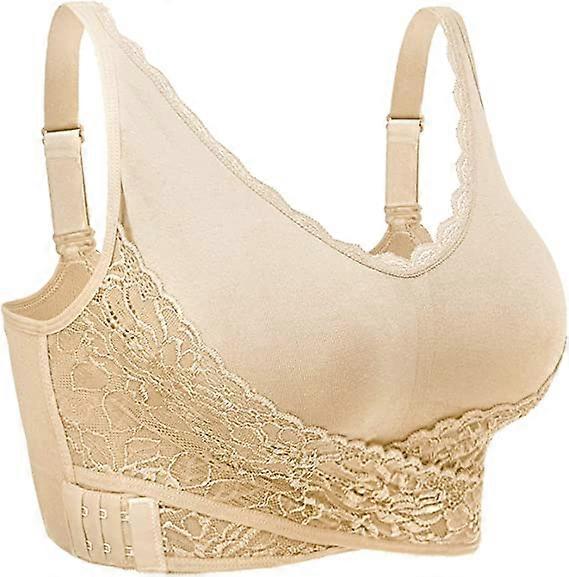 XIANRENGE Womens Sports Bra Front Cross Side Buckle Push Up Bra Sexy V-Neck Lace Bralette Wireless Yoga Running Lounge Bra with Removable Pads, Nude