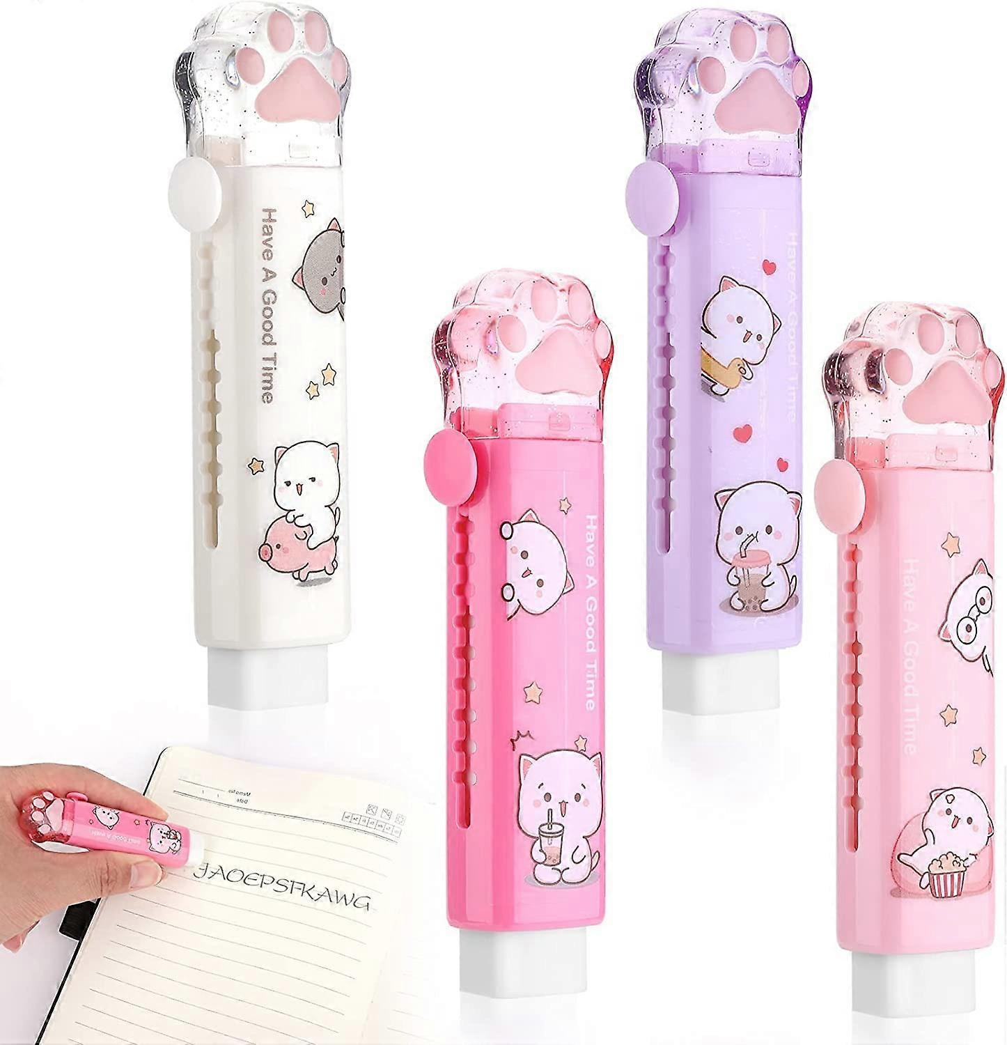 Set of 4 Kawaii Kids Cat Paw Retractable Rubber Eraser for Writing Drawing School Supplies (4 Colors)