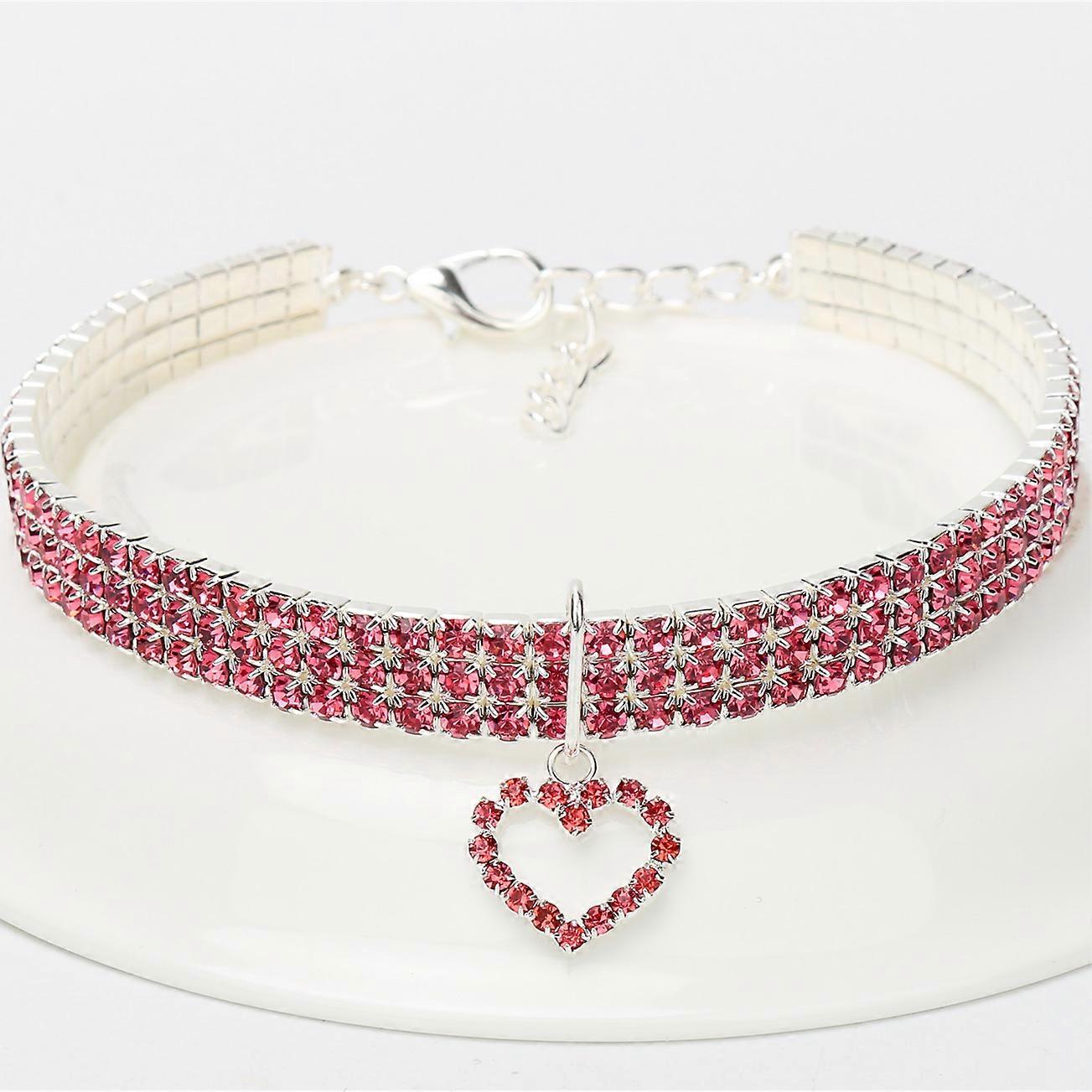 Dww-A Pink M Elastic Love Cat and Dog Jewelry, Adjustable 3 Rows Crystal Diamond Cat and Dog Elastic Pet Necklace Pendant