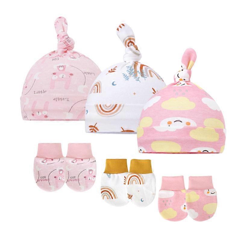 Dww-3Pcs Baby Hats and 3Pcs Baby Gloves, Newborn Hats and Protective Mittens, Matching Hats and Scratch-Resistant Mittens for Baby Girls and Boys (0-6