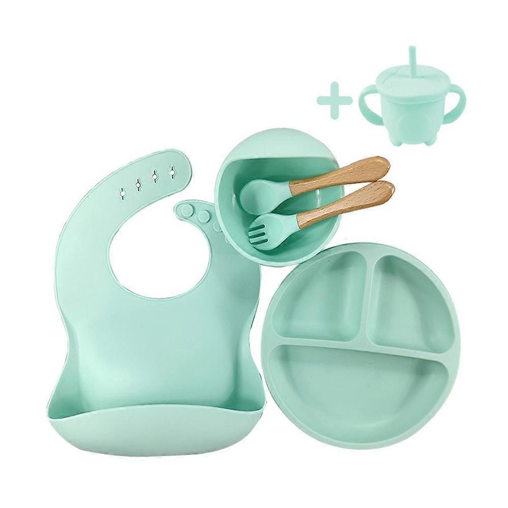 Dww-Set of 6 Green Flat Plates, Silicone Baby Food Supplements, Flat Plates, Bowl, Fork, Spoon, Bib, Suction Cup, Split Design