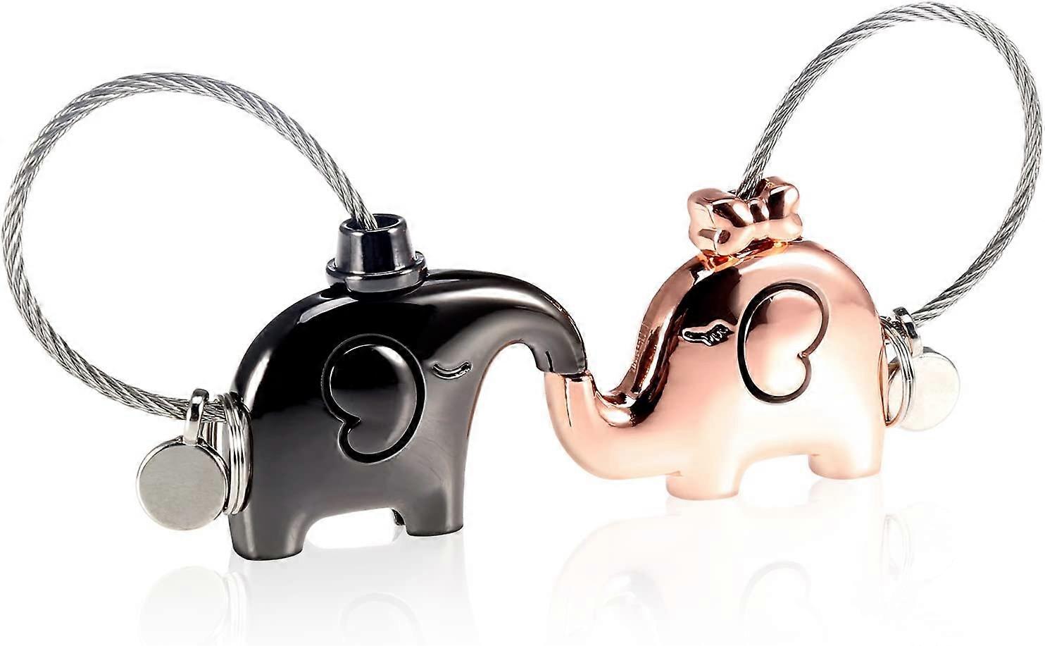 Dww-2 Pair of Detachable Elephant Chain Pendant Keychains for Couples, Lovers, Valentine's Gift, Shiny Zinc Alloy Keychains, Black and Rose Gold