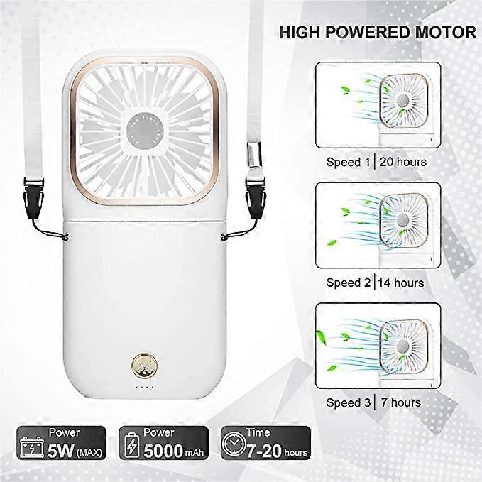 Dww-USB Fan (White) Mini Fan, Silent Handheld Hanging Fan, USB Rechargeable with 3 Speeds, Foldable and Portable Fan for Home, Office and Travel