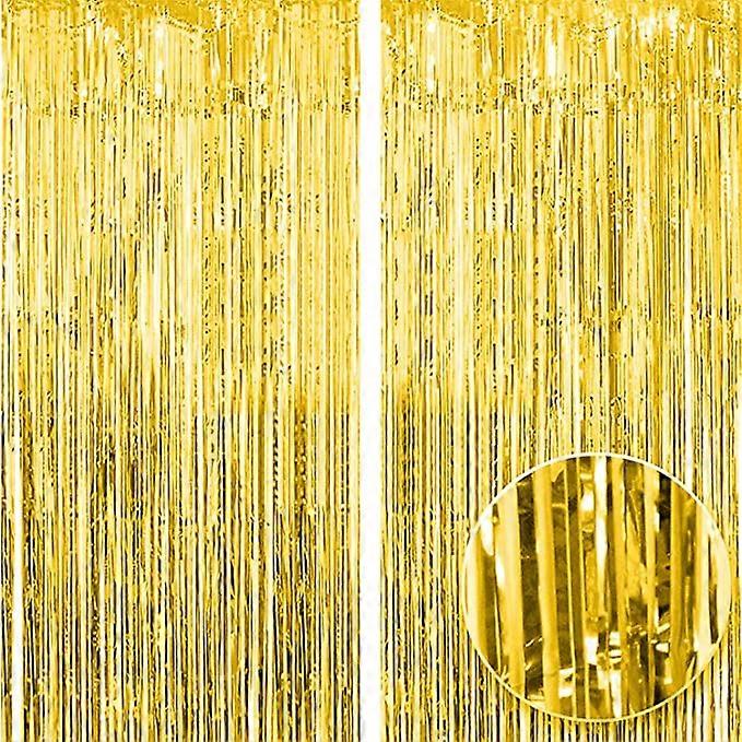 Packing List: 2 sets of gold foil tassel curtains, ample length, each wire width is 6mm, perfect for decorating your party. Easy to Use: Simply peel off the double-sided tape on the back and stick them to the wall, door, or anywhere else; they won't fall off easily. Sparkling: The foil curtain support is made of metal wire with a shiny surface, perfect for adding sparkle as party decorations. The flowing light creates a festive atmosphere for your party, bringing fun and surprises. PERFECT FOR EVERY OCCASION: These shiny foil curtains are used for many special occasions. Perfect for birthdays, weddings, Christmas, New Year's, graduation parties, or as door, window, and wall decorations.