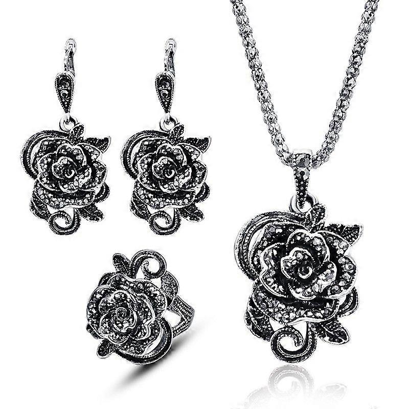 4Pcs Vintage Black Crystal Rose Flower Jewelry Sets for Women Wedding Party Gift