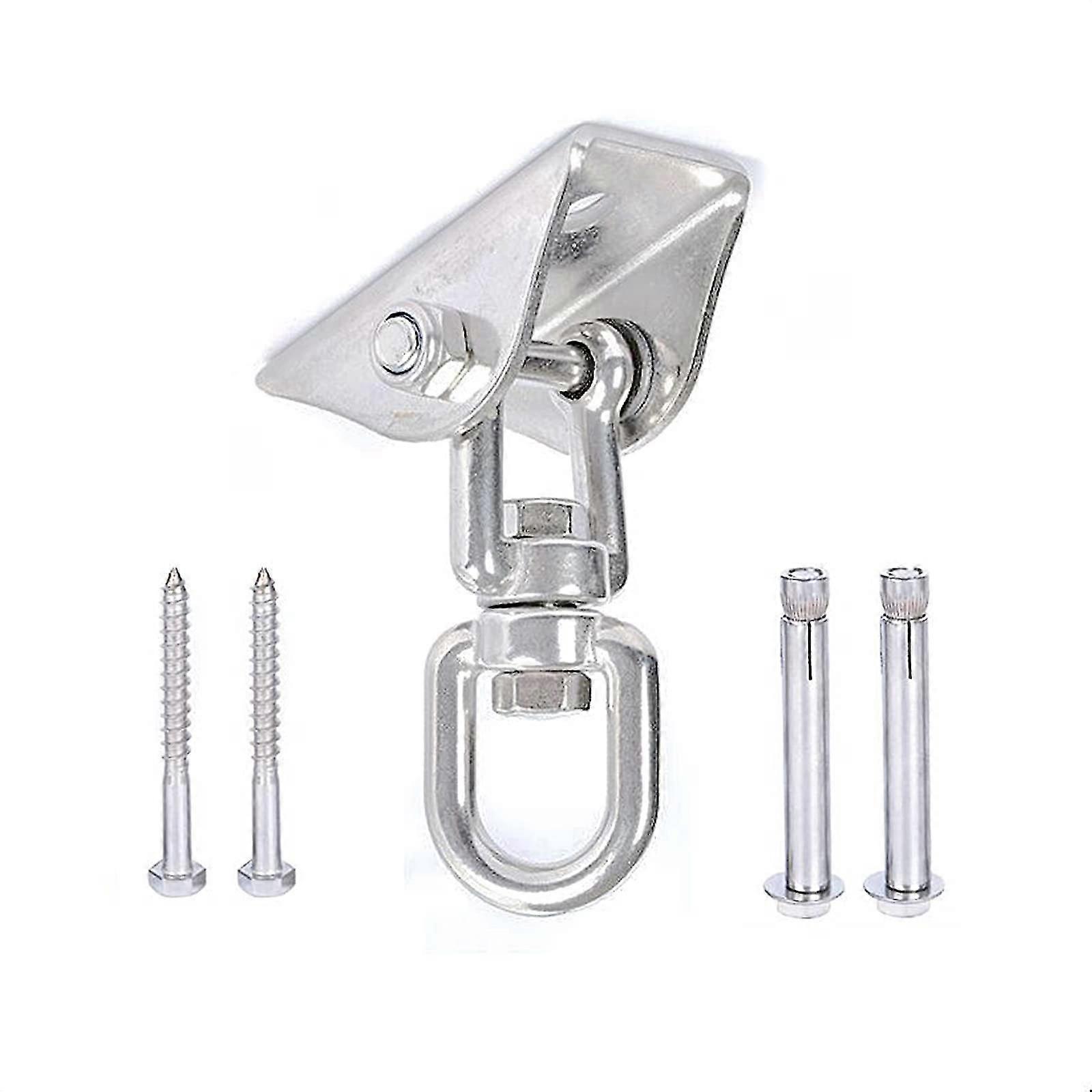 High-Quality Material: Made of high-quality 304 stainless steel, strong and durable. Rust-proof, corrosion-resistant, high hardness, non-toxic, harmless to the environment.Rotatable Design: Practical and practical rotatable design, more flexible way of use. The buckle rotation allows 360-degree rotation without tangling or twisting.Strong Elasticity: The hook is not only rotatable, it has a spring buckle, which is more in line with the needs of most people, and can help you safely lock the hook without falling by itself.Easy To Install: Two holes are pre-drilled on the hammock frame and bolted to the concrete. Including 2 expansion bolts and 2 hex bolts as a complete set of accessories, which can be assembled in a few minutes.Application: The hanging hook is very suitable for indoor and outdoor relaxation. You can install it and hang it on the swing chair, hammock, yoga belt, and also suitable for chandelier and sun sail.