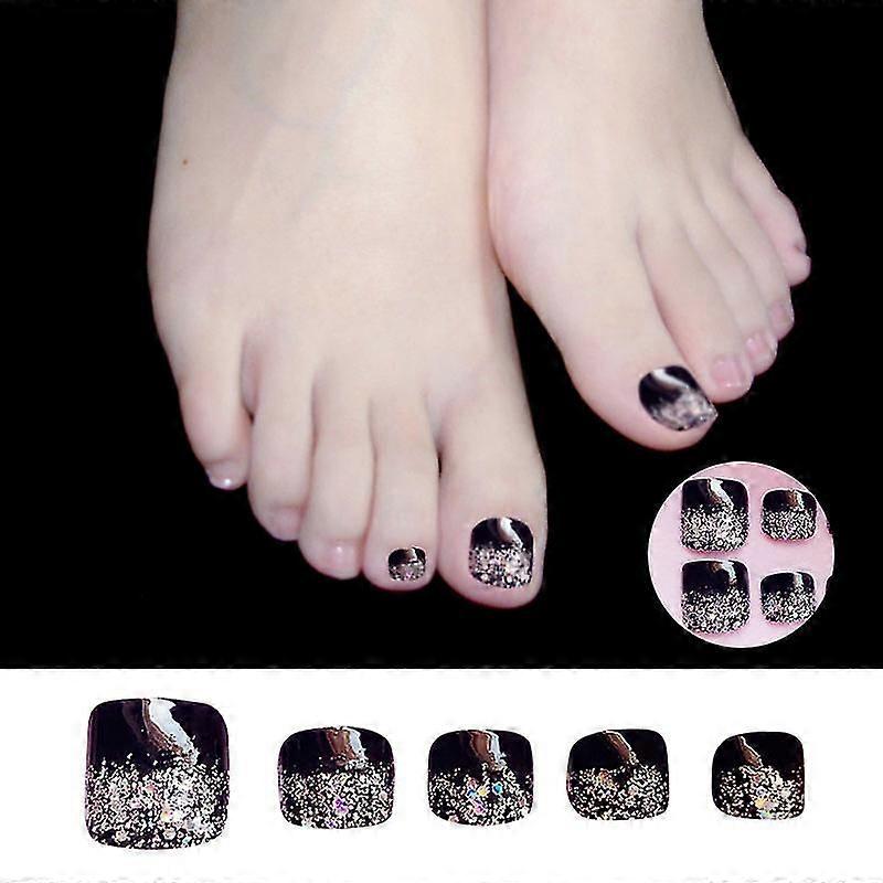 24 Pcs Shine False Toe Nails Tips Bow Glitters Pedicure Patches Fake Toe Nails Stickers @BUGU