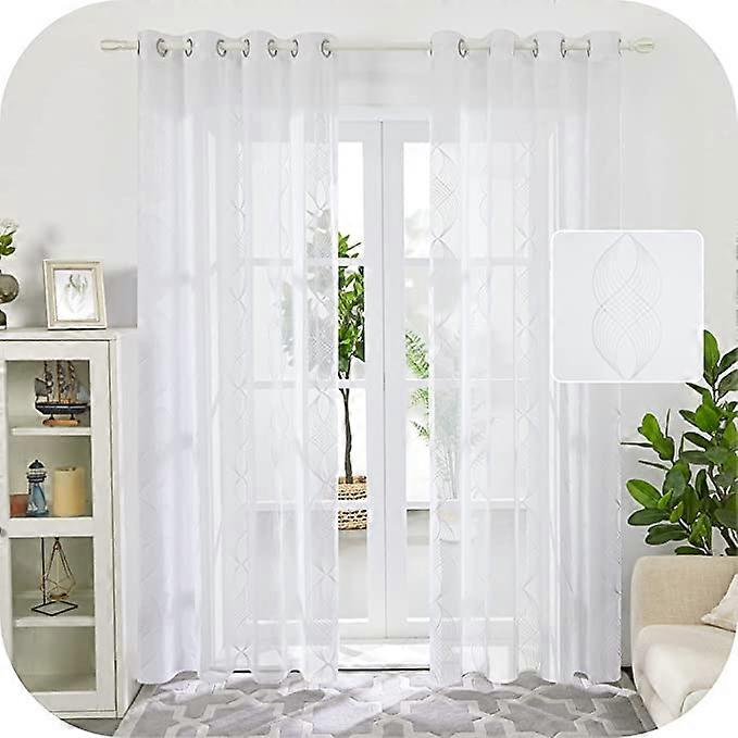 Dww-White Linen-Effect Sheer Curtains with Eyelets and White Embroidered Pattern 140x240cm Boy's Bedroom Curtain