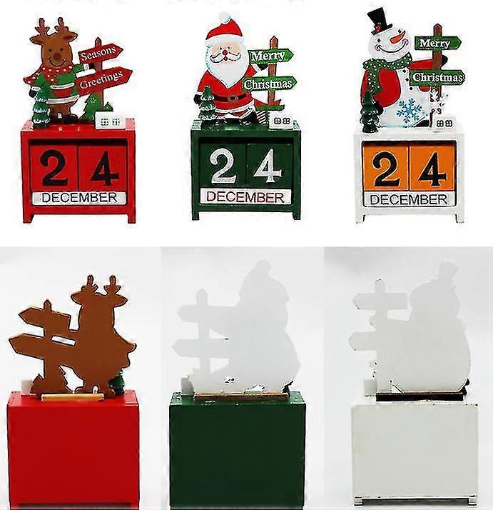 Name: Christmas calendar size: as shownName: Christmas calendar size: as shownMaterial: Wooden Weight: about 107gStyle: Deer, Elderly, Snowman Packaging: Individual carton packaging, weighing approximately 127g,The carton size is about 14.5*8*4cmPurpose: used to record date and other related information