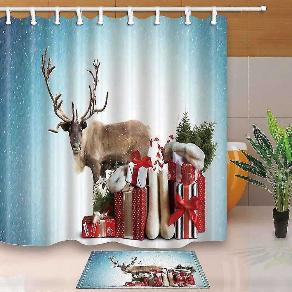 Xmas Bath Curtain Christmas Elk Antlers Reindeer With Gift Box In Fir Twig Shower Curtain 160x180 Cm With Floor Doormat Bath @BUGU