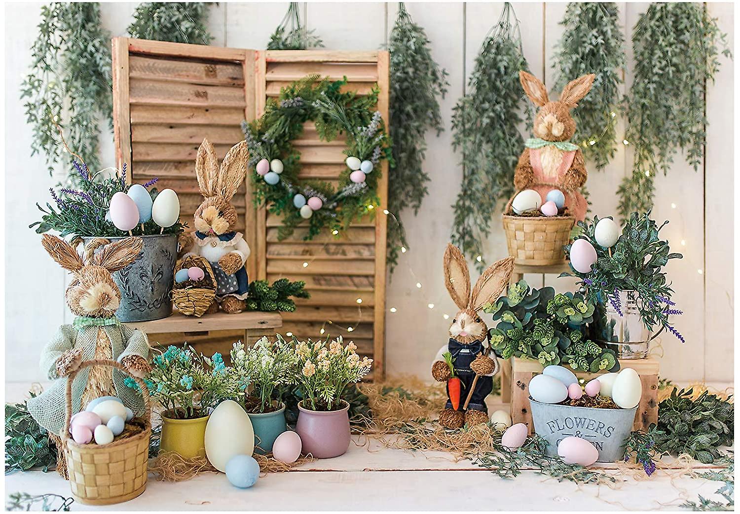 7x5ft Happy Easter Photography Backdrop Spring Rustic Wooden Wall Colorful Eggs Rabbit Background Baby Shower Kids Birthday Party Decor Portrait Banne