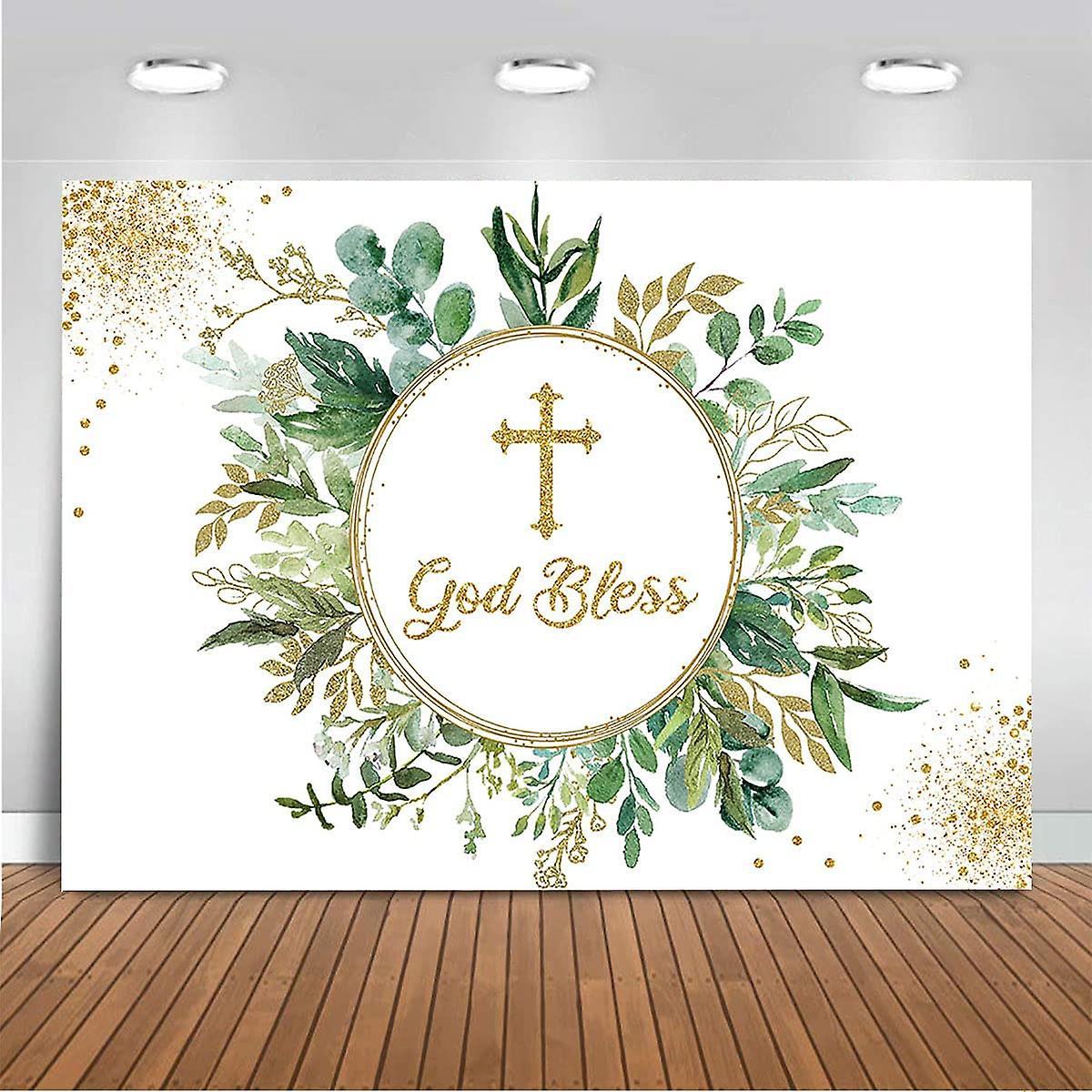 God Bless Backdrop First Communion Baptism Christening Party Decorations Vinyl Green Leaves Newborn Baby Shower Photography Background Photo Booth (7x