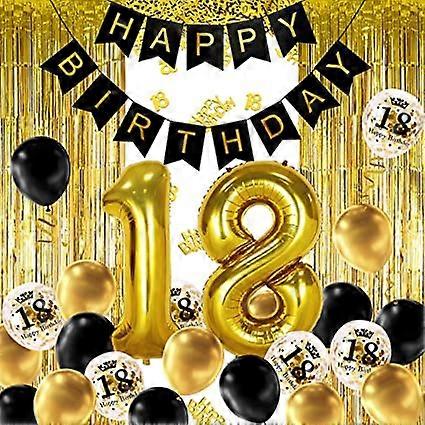 DWW 18th Birthday Decorations in Gold and Black, Happy Birthday Banner, XXL Number 18 Helium Balloon, Gold and Black Fringe Curtain, Latex Confetti, N