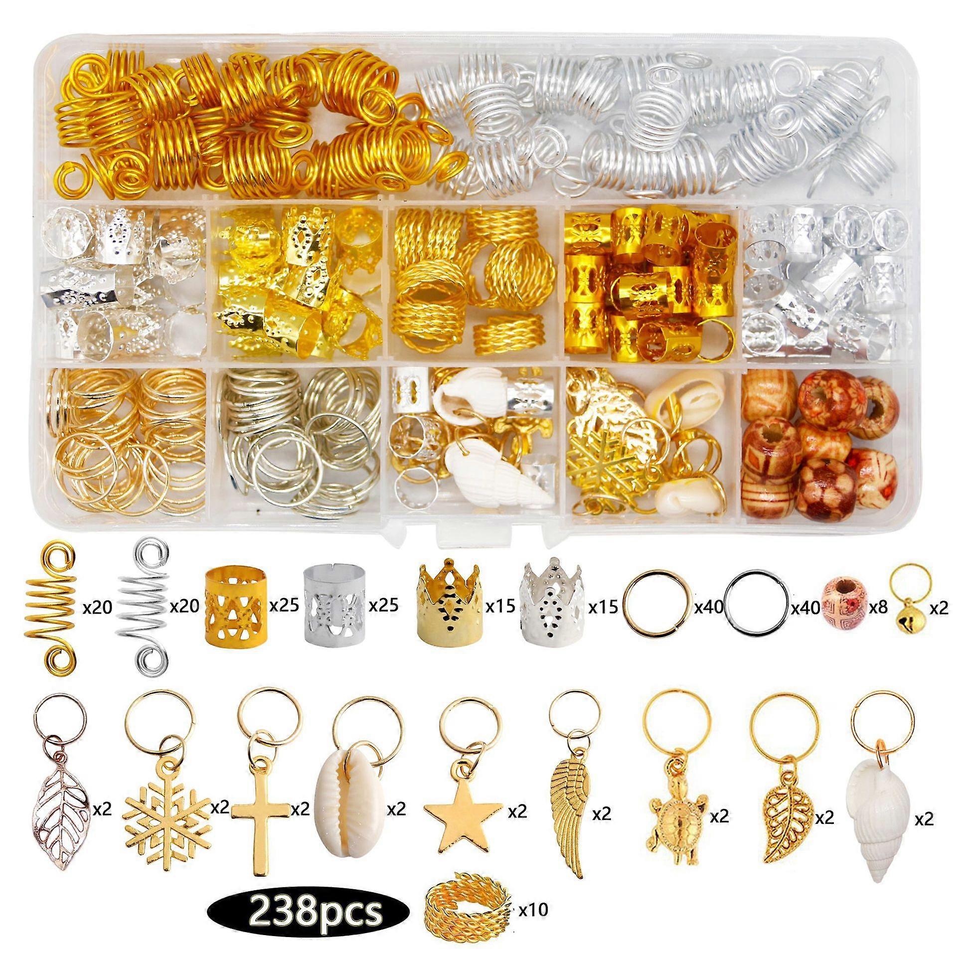 20 different styles: includes accessories, rings, and aluminum dreadlock cuffsMultiple uses: Ideal hair accessory for decorating dreadlocks and extensions, suitable for women and girls, allowing you to change your styleMaterial: Made of flexible and pliable aluminum, it won't rust or corrode. The color won't fade easily. You can adjust the ring size to suit your hair volume.Easy to use: simply braid your hair in the desired style, then open the ring and place it around the dreadlocks or braids, then close it by gently pressing to secure it.Quantity: The package includes 238 hair accessories in assorted colors and styles.