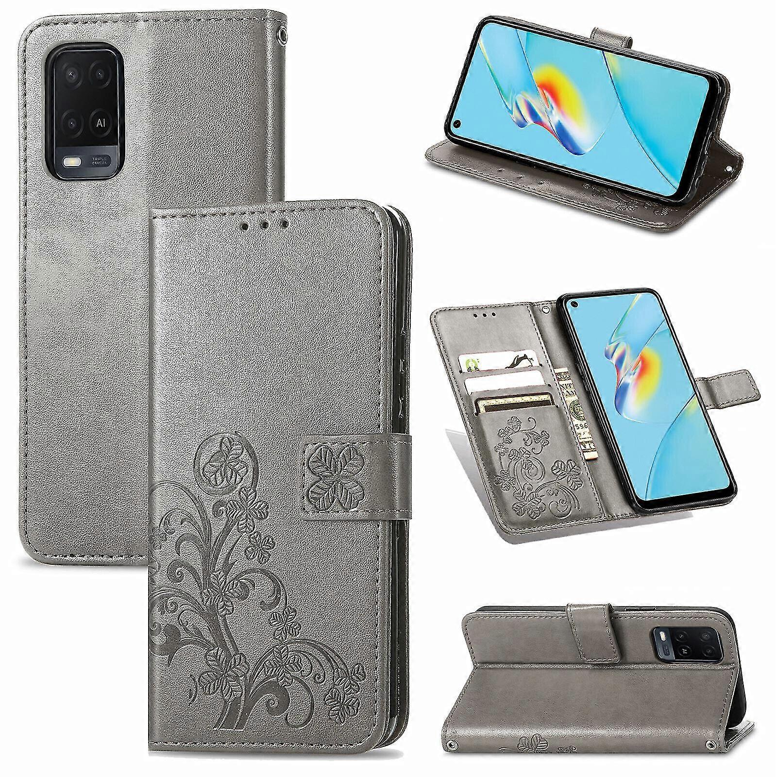 Compatible With Oppo A54 4g Cover Wallet Clover Embossed Protective Leather Phone Case - Grey