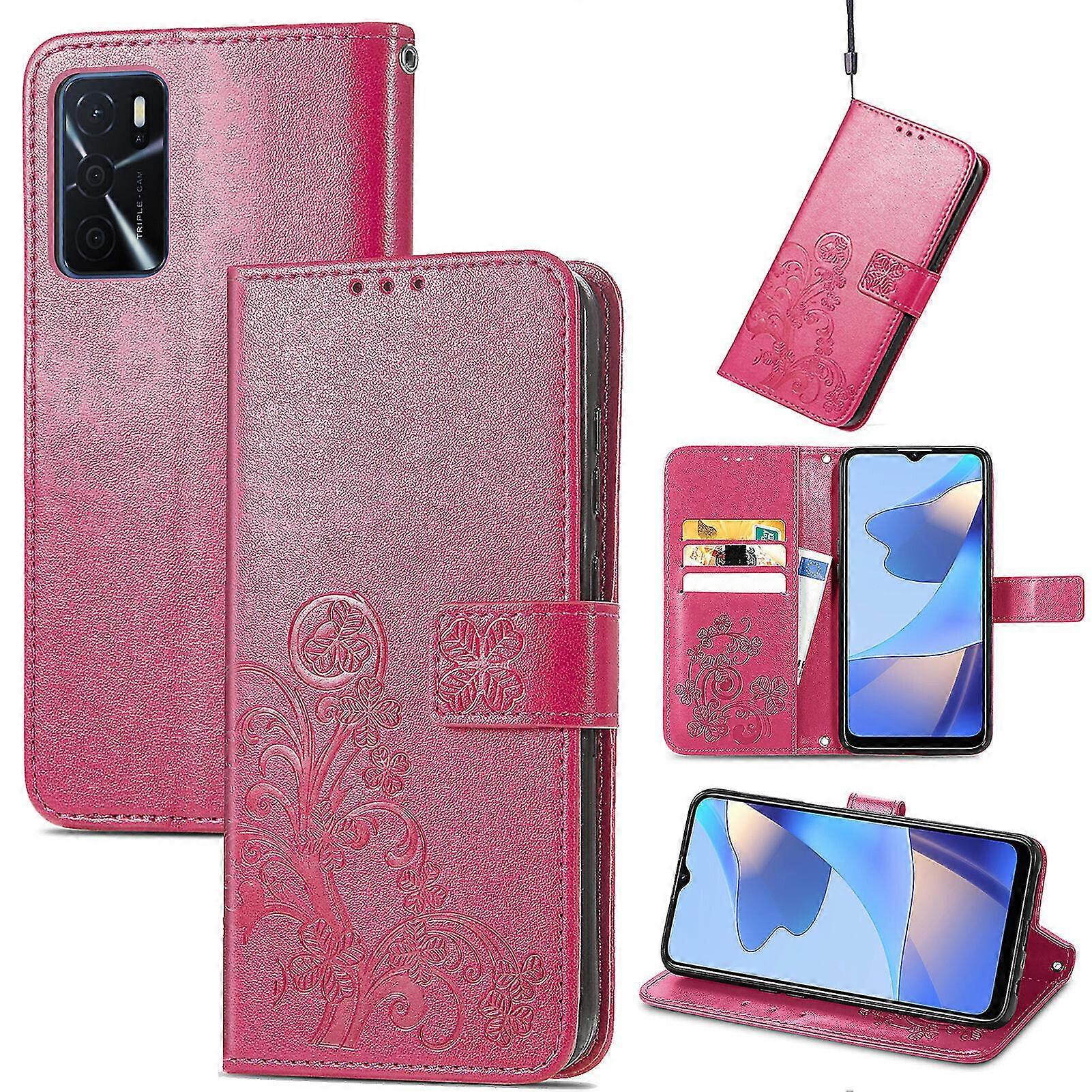 Compatible With Oppo A16 Cover Wallet Clover Embossed Protective Leather Phone Case - Rose Red
