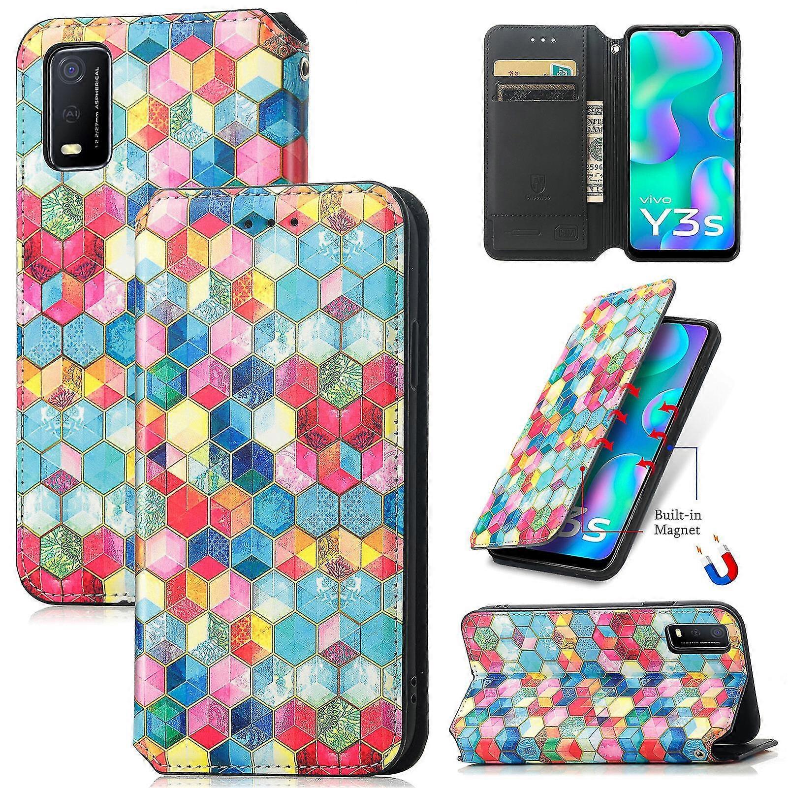 Compatible With Vivo Y3s 2021 Case Folio Flip Leather Colorful Cover Card Slot Holder Kickstand Coque