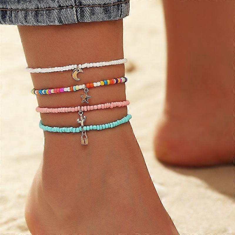 Dww-4 Pieces Bohemian Multilayer Beaded Ankle Bracelet Colorful Women's Ankle Moon and Star Pendant Ankle Beads Elastic Foot Bracelet Summer Beach Jew