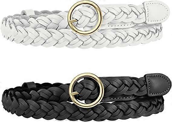 Dww-2 Pieces Retro Woven Thin Suspenders for Women (White + Black), Tight PU Leather Circular Japanese Button Woven Suspenders, Used for Denim Dresses
