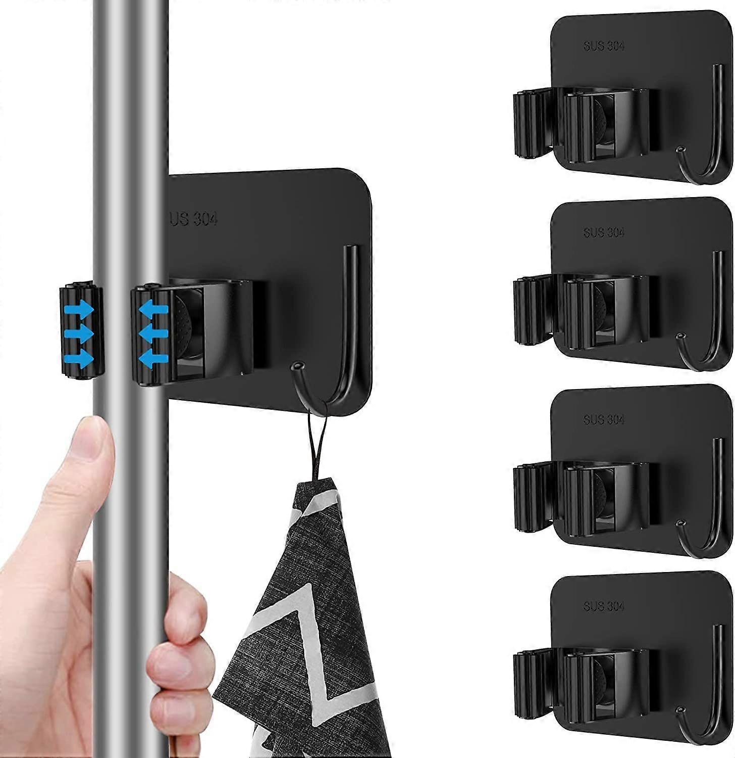 Dww-4 Mop and Broom Holder (Black), No-Drill Stainless Steel Wall-Mounted Mop Holder with Hanging Hook, Broom and Mop Organizer for Bathroom, Office,