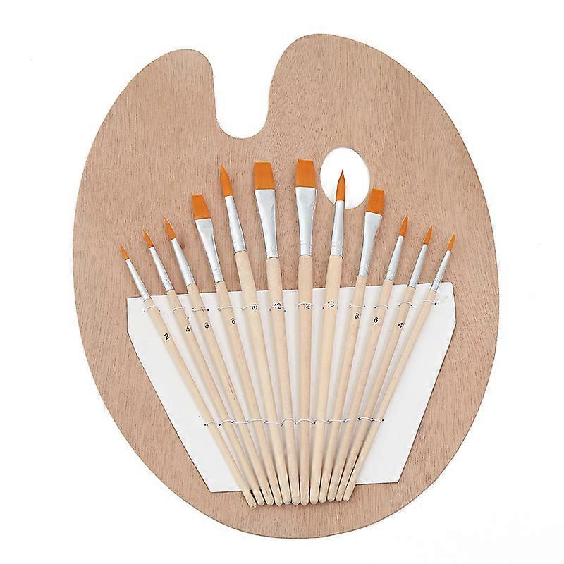 Dww-Set of brushes with wooden palette (12 brushes) and oval hand-held artist palette - for use with acrylic, oil and watercolor paints - for painting