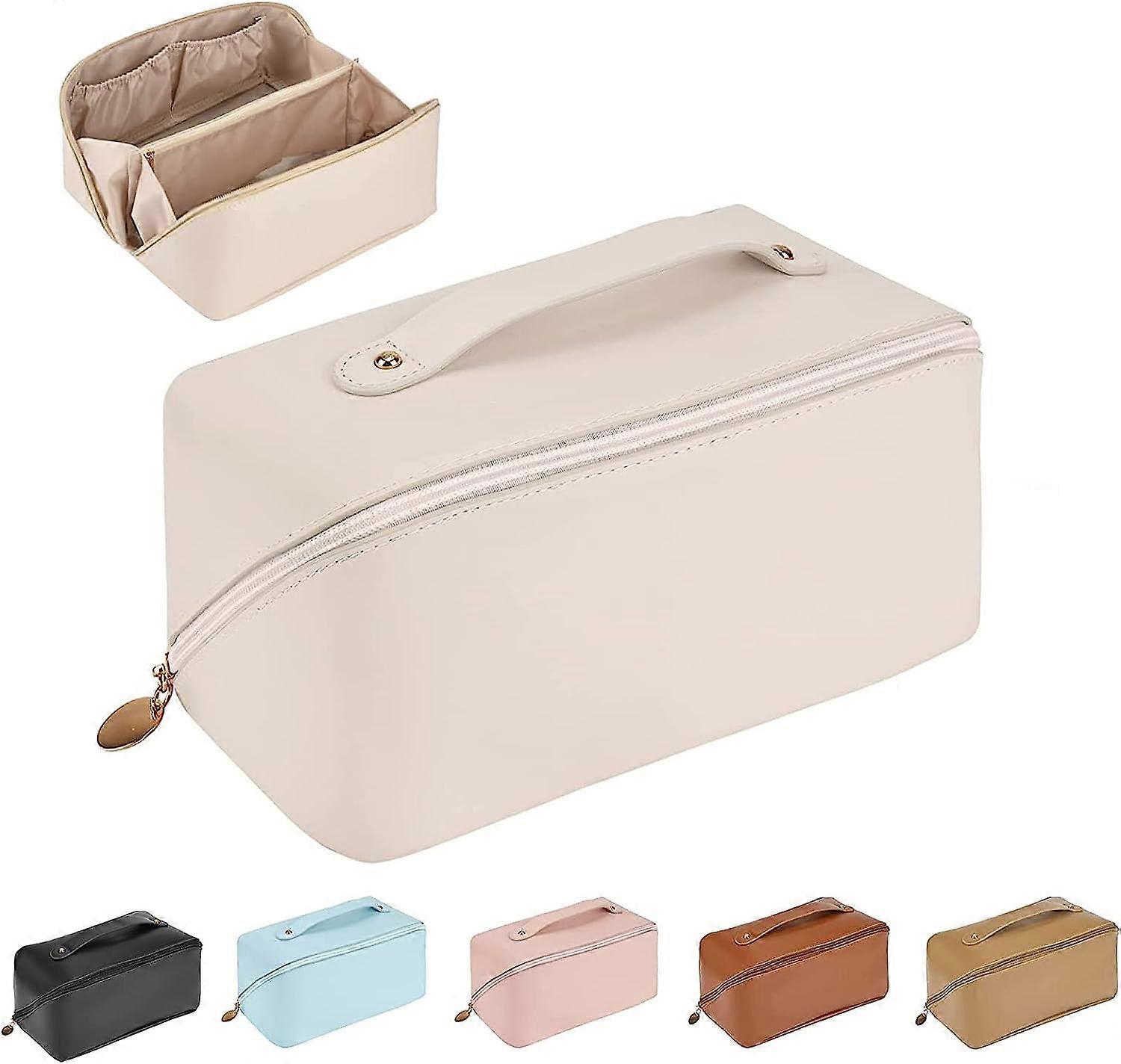 Dww- (White) Makeup Bag, Large Capacity Travel Makeup Bag, with Handle and Divider, Waterproof PU Leather Toiletry Organizer for Women, Multifunctiona