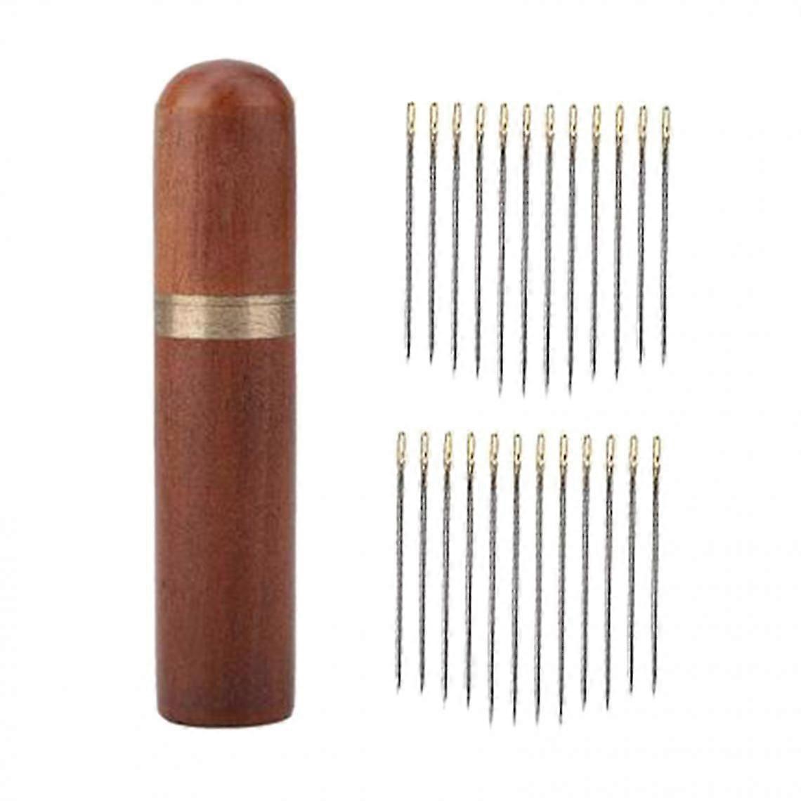 24x Self-Threading Needles With Wooden Needle Case Brown_Golden Needles