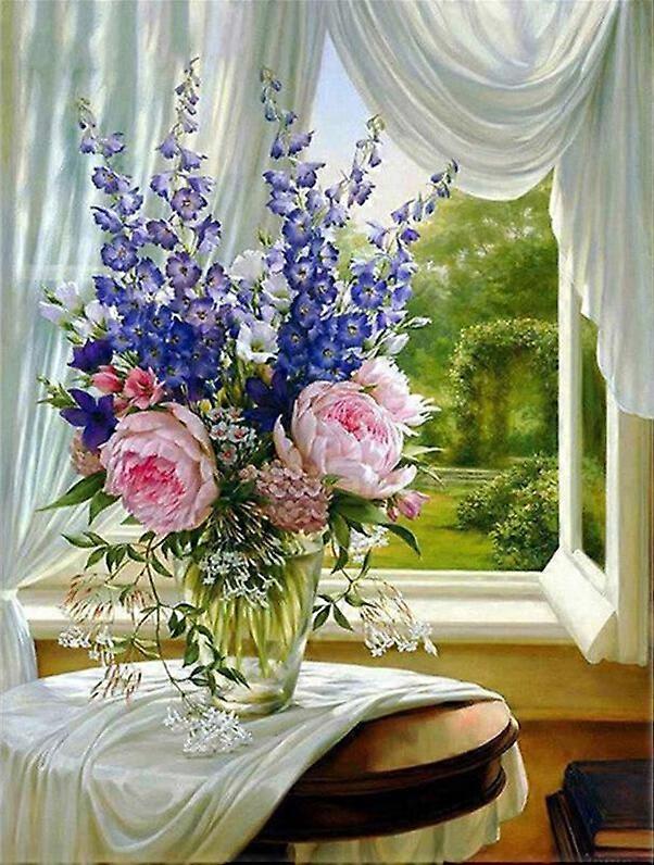 DWW-30 x 40 cm, Bouquet in front of the window Diamond Painting Diamond Embroidery Painting5D Canvas Painting for Children and Adults, Rhinestone Puzz
