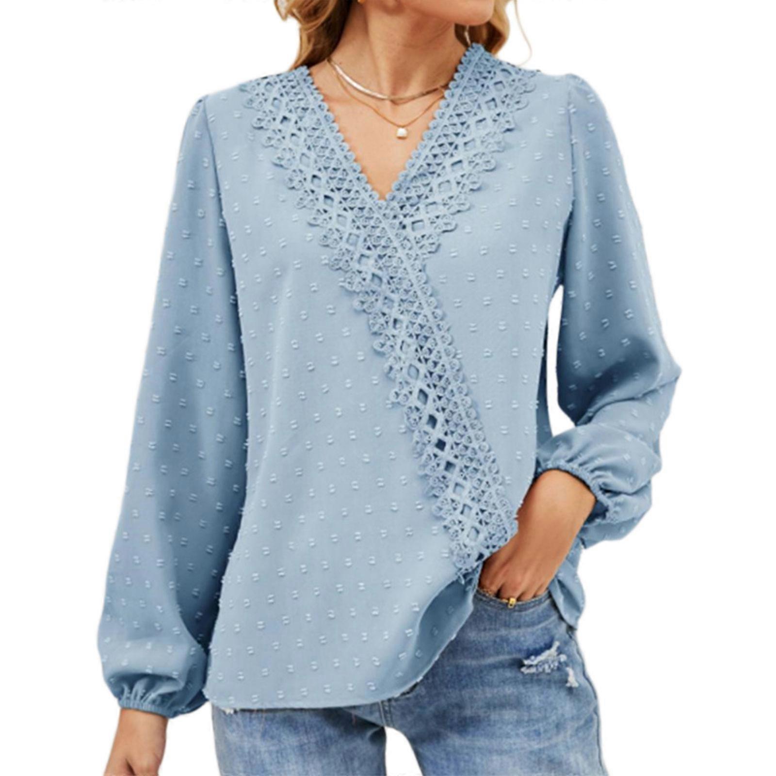 Women Puff Long Sleeve Chiffon Blouse Sexy Wrap V-Neck Lace Trim Splicing Shirt Solid Color for Swiss Dot Loose Pullover