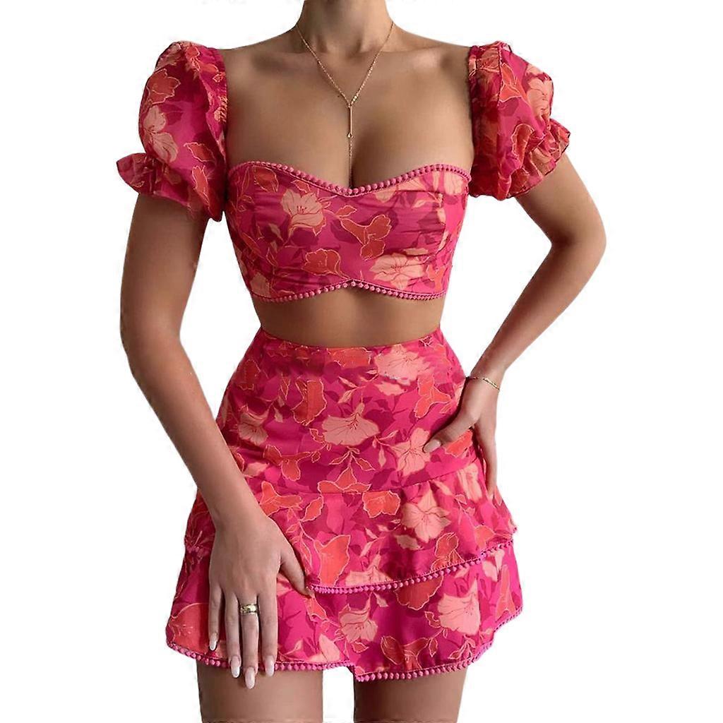 Womens Summer Sexy 2 Pieces Outfits Set Puff Short Sleeve Square Neck Crop Top and High Waist Mini Skirt Floral Print Pompom Trim Streetwear