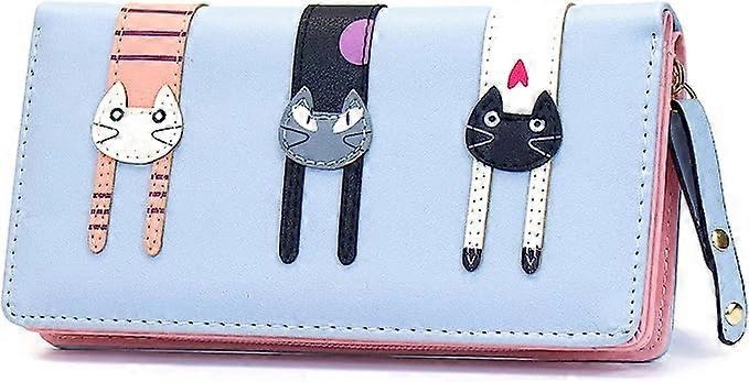 Dww-(Light Blue) Mini Faux Leather Long Bifold Cute 3 Cats Zip Clutch Handbag Women's Gift