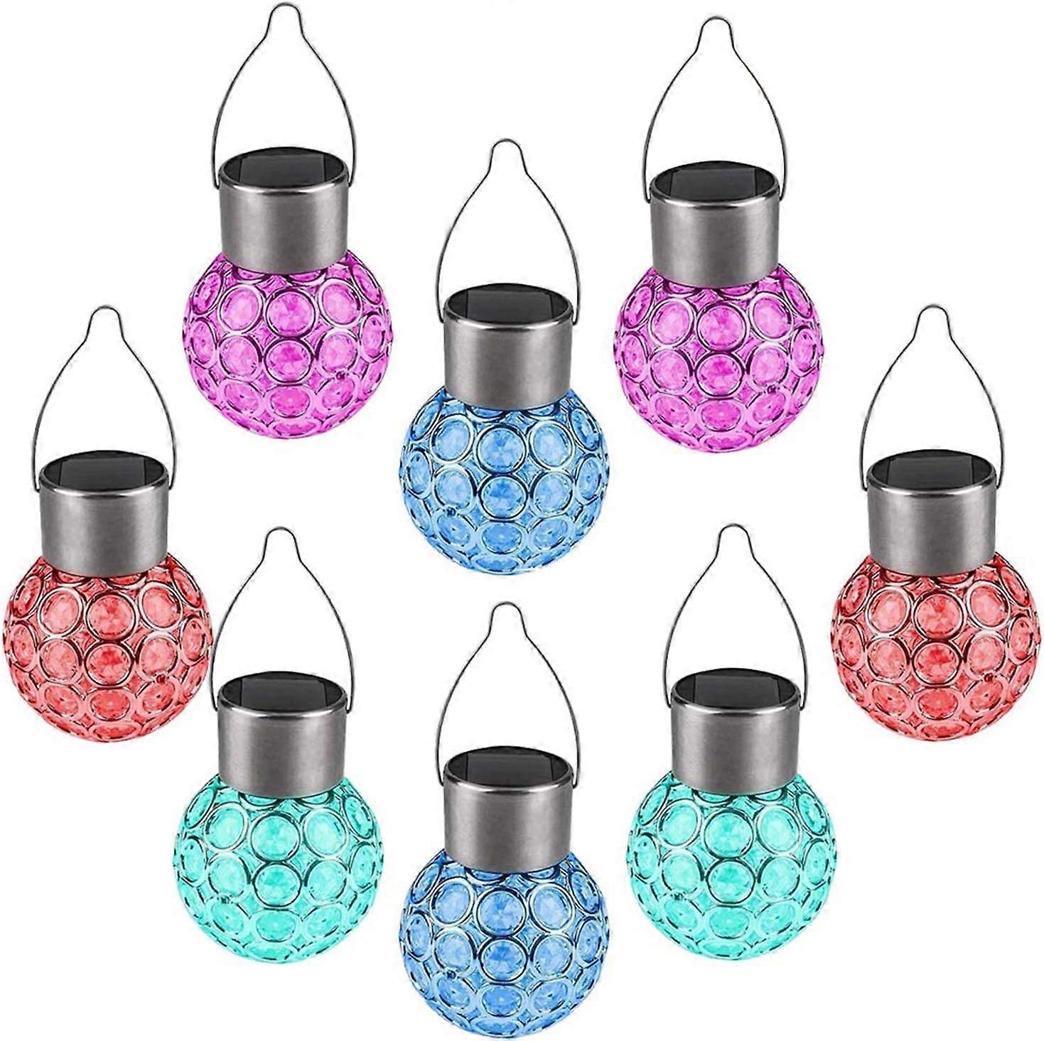 Upgraded Solar Panel The outdoor hanging solar lamp has been upgraded to a polysilicon solar panel, collecting solar energy more efficiently and charging the internal battery better.Color-Changing Solar Hanging Lights - Pack of 8 solar hanging lights with red, green, and blue color-changing lighting. A great solar Christmas decoration or outdoor tree ornament. These solar-powered garden lightsgive your garden, yard, terrace or your holiday a special atmosphere.Easy installation. No wiring required; simply slide the switch to the "ON" position and hang these outdoor solar pendant lights in a location where they can absorb direct sunlight. Perfect for that extra ambiance.of the holiday season, and it's a good outdoor tree ornament.Multiple options: Mounts on any surface or can be hung with the integrated hanging loop. Perfect for decorating the garden, table, balcony, or outdoor space. A great gift for your friend.