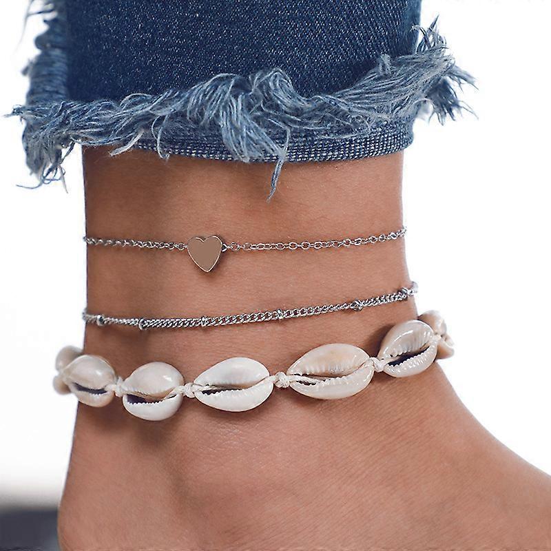 Boho Geometric Conch Shell Love Peach Heart Beaded Chain Anklet Three-Piece Set Barefoot Sandals for Women and Girls