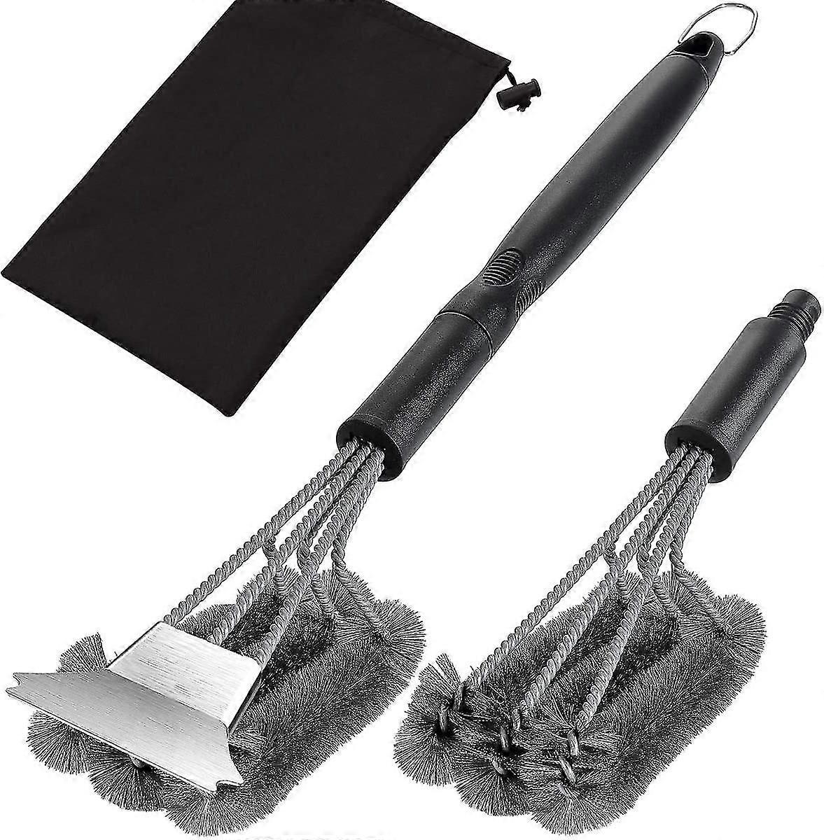 TWO GRILL WIRE BRUSH HEADS IN INNOVATIVE DESIGNE( We have upgraded where the brush head screwed into the handle to avoid the handle breaking apart. ) Our heavy duty grill brush set combines with a storage bag, a long anti-slip handle and two grill wire brush heads for alternate use, even one of which is equipped with a scraper. Such multi-purpose type of barbecue brush is an exclusive version improved from all grill cleaner brushes.^PREMIUM MATERIALS & GREAT BRISTLE STRENGTHOur backyard bbq accessories are made of high-quality stainless steel, which provides a sturdy construction refuse to bend during tough scraping tasks. Unlike the coiled metal pads on some other brushes, the steel bristles of our grill cleaning kit stay intact and upright with no signs of breakage or shedding.^360 BBQ BRUSH FOR 5X FASTER CLEANINGThe 3-in-1 bristle head rotating up to 360-degrees, makes the bbq brush flexible enough to fit between the grill grates to clean both the top and sides. The grill scraper and 2 grooves for round grates can easily cut through the toughest residues on the grill without leaving any scratches.^EXTRA LONG AND SOLID HANDLE WITH ERGONOMIC DESIGN( New version grill brush handle, super sturdy ) The handle of our grill cleaning brush has an amazing grip to clean even the toughest messes without falling apart. Rounding out the impressive features is an 20.5" handle that will make sure that our grill brush for gas grill that reaches all parts of the grill and prevents your hand from heat.^UPSCALE BBQ CLEANING KIT AS PERFECT GIFTCompatible with any modern BBQ grill, our grill brush and scraper with extra grill wire brush head and carrying bag can be a wonderful gift for family and friends who have a gas, charcoal, porcelain, infrared grill.^
