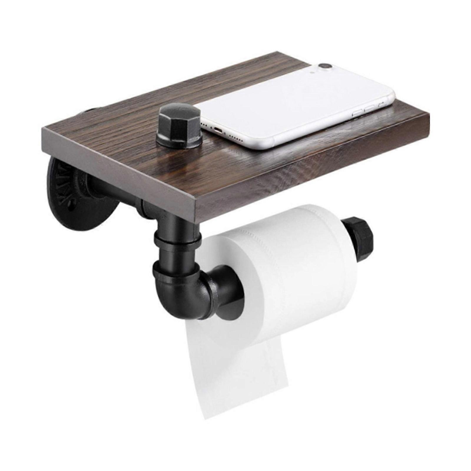 Vintage Toilet Paper Holder with Rustic Wooden Shelf Metal Pipe Paper Roll