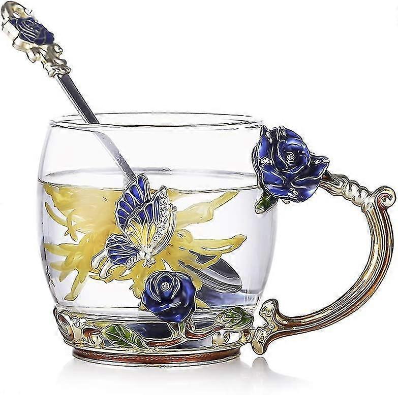 Enamel Butterfly Flower Glass Coffee Cup Set with Steel Spoon, Blue