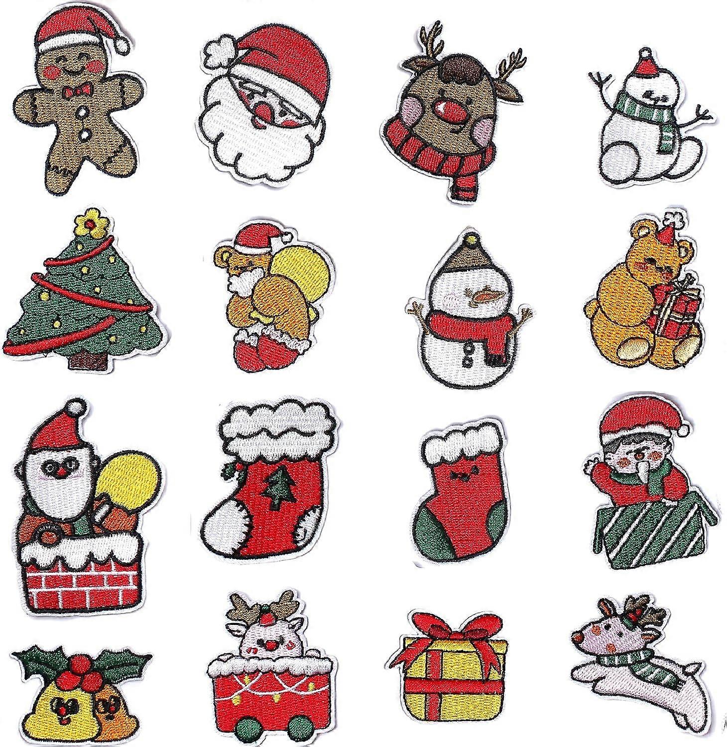Dww-Lot of 16 iron-on embroidered Christmas-themed patches in the shape of stockings, snowmen, gifts and Santa Claus