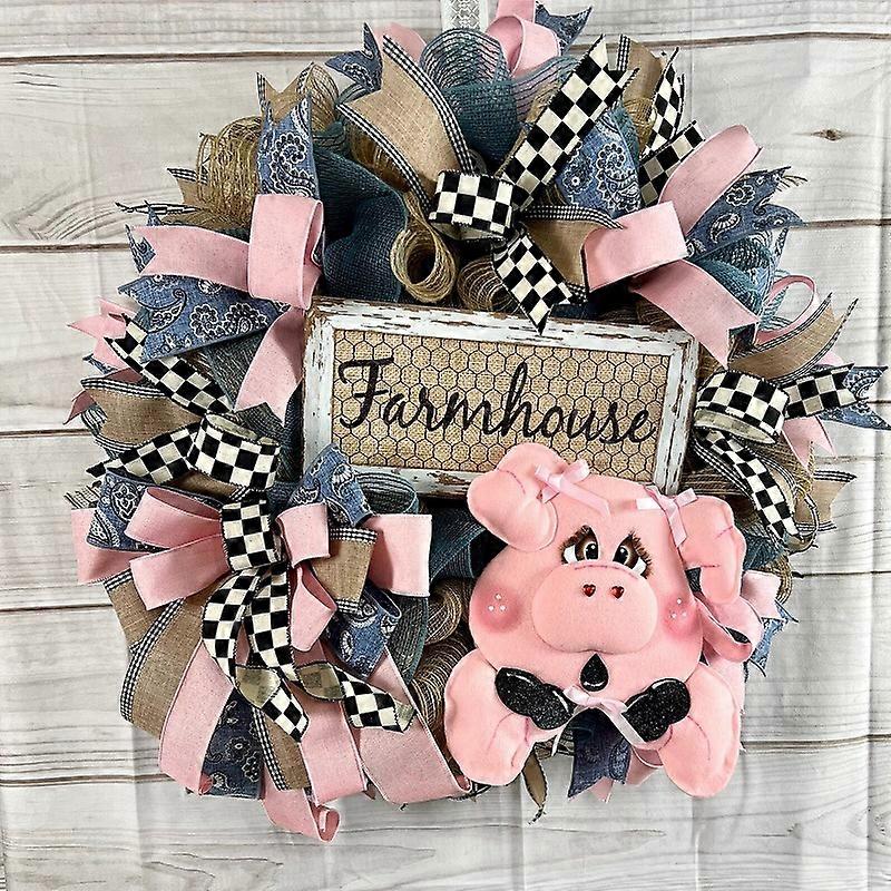 Dww-35cm - Flower Wreath with Simulated Pig Head, Rustic Autumn Hanging Flower Wreath with Farm Pig, Decorative Door Hanging