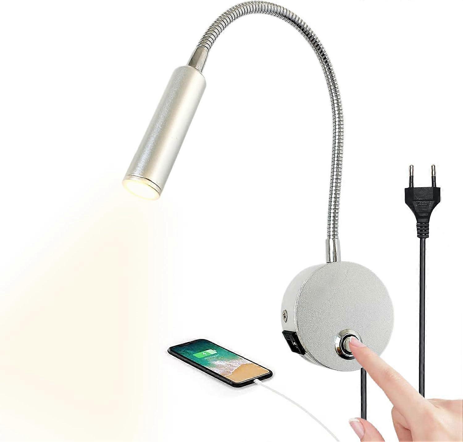 Dww-Touch Dimmable Wall-Mounted Reading Lamp, LED Bedside Reading Light with USB Port and Switch, Flexible Gooseneck Light with Plug, 3W Bedside Wall